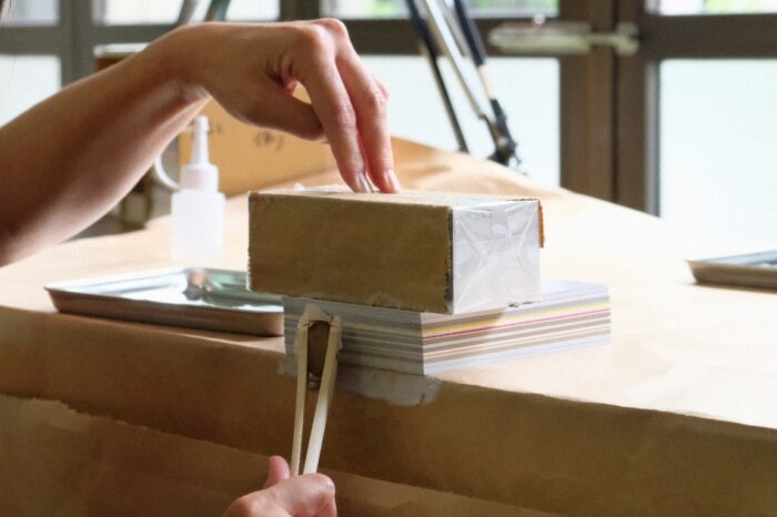 The GlueNote workshop begins with selecting papers of different colors and textures. Using brushes and glue, you will shape your own memo notebook.