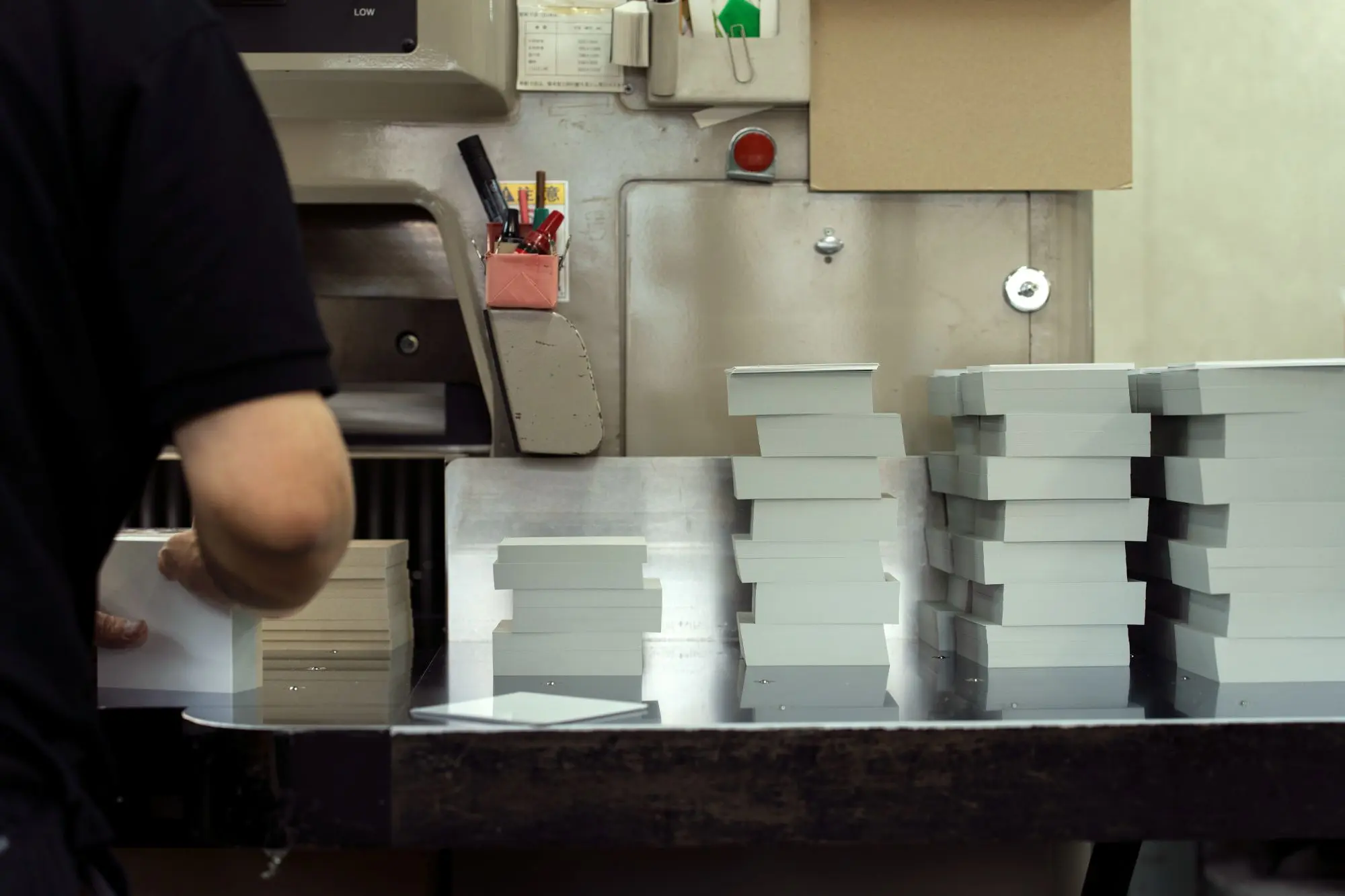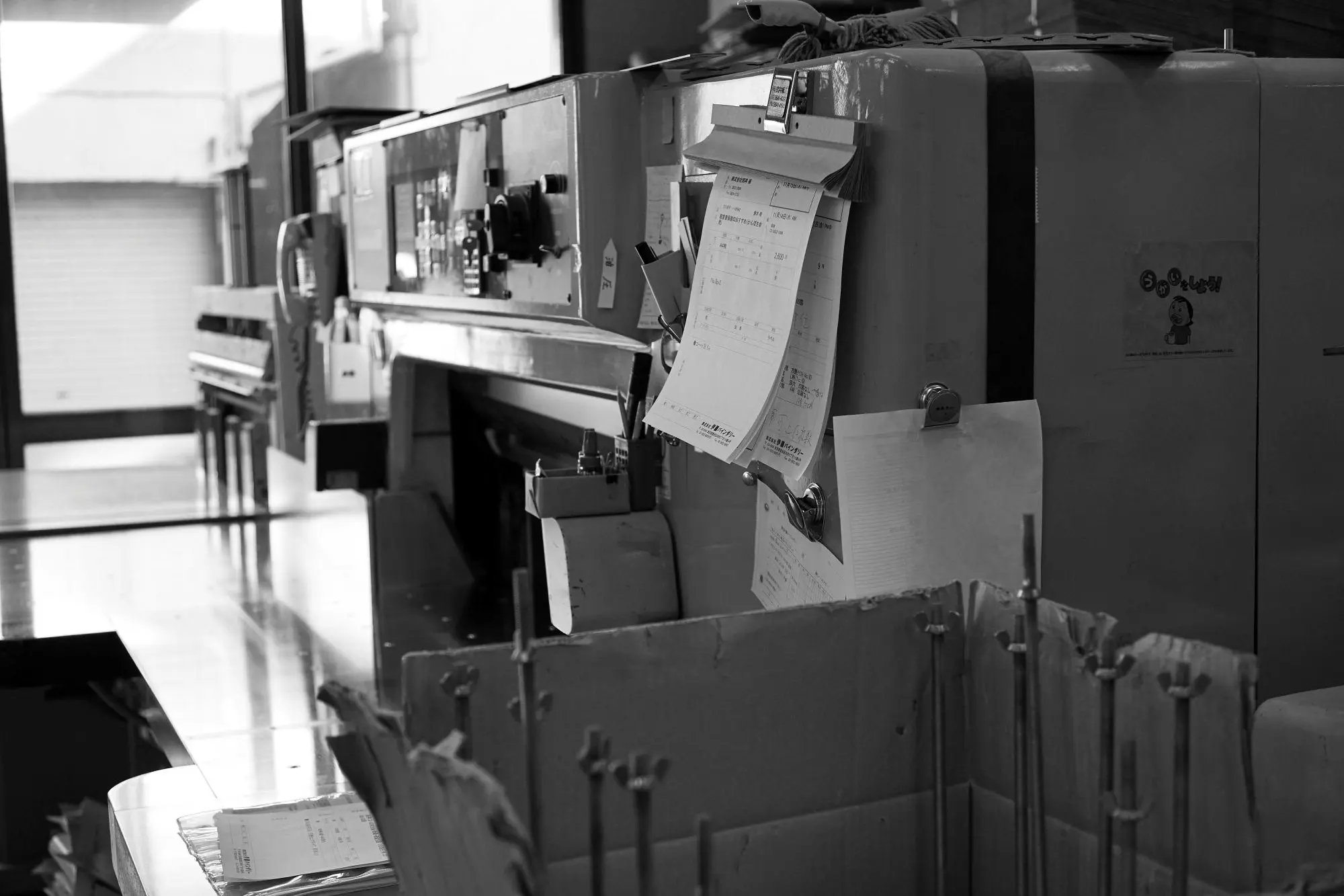 大きな窓越しに断裁機が紙を切りそろえる様子が見える。