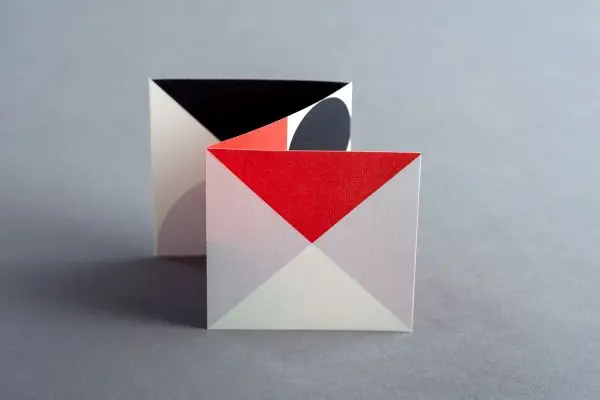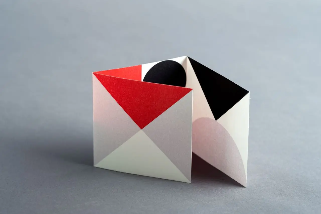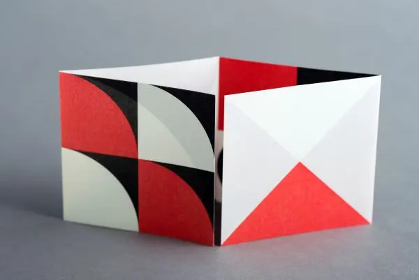 両端を内側に折り込み、さらに2つ折りする、観音開きの折り方です。お店や会社のパンフレットやリーフレットとして使われることの多い折り方です。