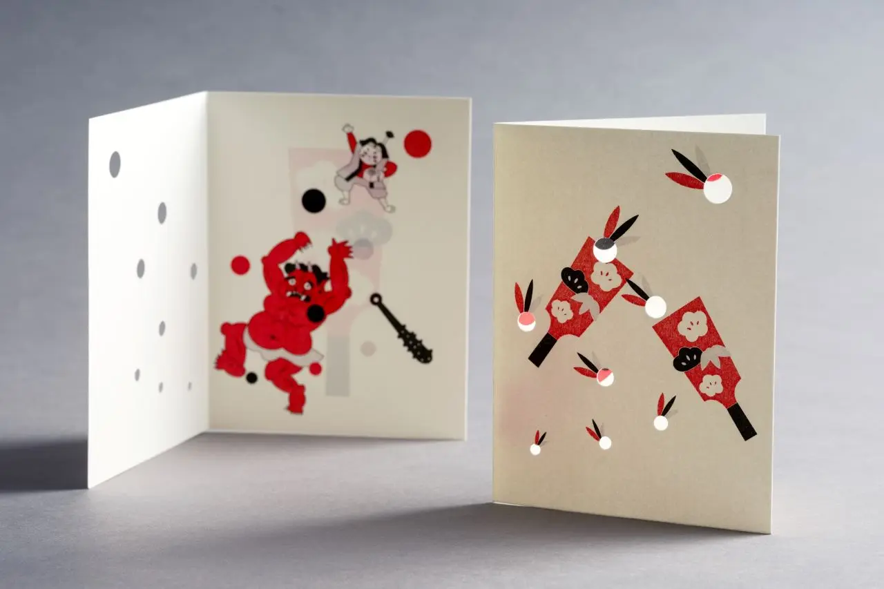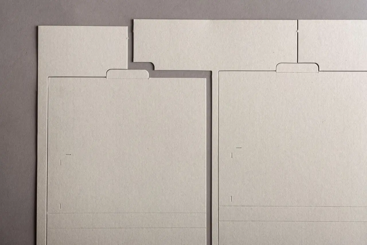 窓あき表紙や、会社案内などによく見られるポケット付きの中綴じ冊子も対応可能です。当社の製品のパッケージも抜き加工された古紙を使用しています。